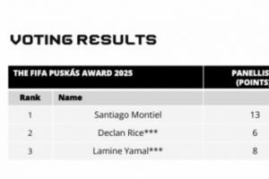 FIFA普斯卡什投票结果:蒙铁尔21分第一,赖斯亚马尔17分分列二三