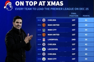 体育资讯12月19日讯 《转会市场》列出了近年英超圣诞榜首球队的积分及最终排名,近7年仅3队最终夺冠。
